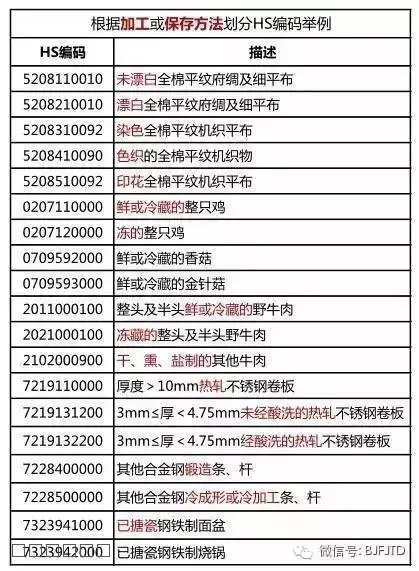 如:鮮的、冷藏的、冷凍的、干的、熏制、鹽腌、糖漬、烹煮、焙炒、去殼的、提純、精制、發(fā)酵、滾壓、未搪瓷、切割、鍛造、沖壓、冷軋、冷拔、熱軋、鉚接、電鍍、鍍鋅、包金、包覆、編結(jié)、鑲嵌、酸洗、針織、機織、鉤編、印花的、染色的、色織的、漂白、未漂白、未梳的、浸漬、涂布、與棉混紡、玻璃吹壓成膜、冷卻成型、人工合成、未經(jīng)化學處理的……
