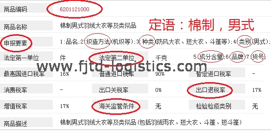 申報(bào)要素:織造方法(機(jī)織/梭織)、種類(羽絨服)、類別(男式)、成分含量(比如80%)、品牌、貨號(hào)。法定第一單位:件,法定第二單位:千克。