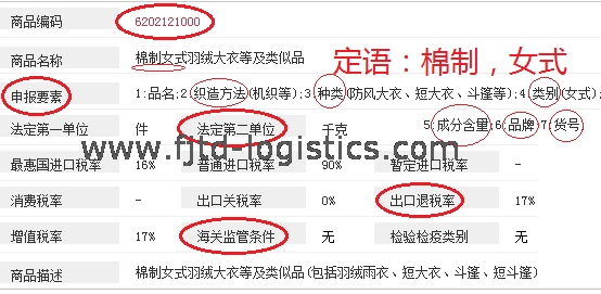 申報(bào)要素:織造方法(機(jī)織/梭織)、種類(羽絨服)、類別(女式)、成分含量(比如80%棉)、品牌、貨號(hào)。法定第一單位:件,法定第二單位:千克。