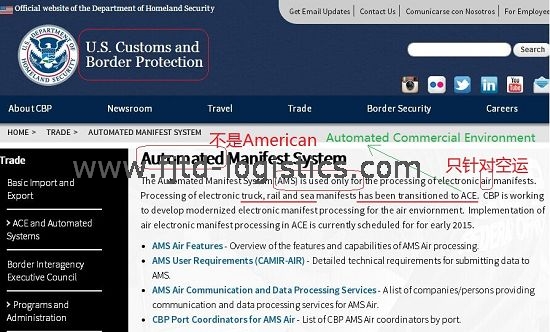 The Automated Manifest System (AMS) is used only for the processing of electronic air manifests. Processing of electronic truck, rail and sea manifests has been transitioned to ACE.  CBP is working to develop modernized electronic manifest processing for the air environment. Implementation of air electronic manifest processing in ACE is currently scheduled for early 2015. 懂英文的朋友,自己去體會。更多詳情請看:https://www.cbp.gov/trade/automated