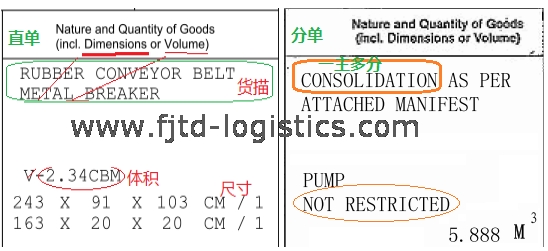 Consol和consolidation意思差不多,都是表示“混載”“拼裝”,一般可以通用。如果一個(gè)航空主單(MAWB)對(duì)應(yīng)多個(gè)航空分單(HAWB),且貨物種類較多,就會(huì)在主運(yùn)單“貨物描述”(Nature and Quantity of Goods(incl. Dimensions or Volume))那里打上“Consol”字樣。如果一個(gè)主運(yùn)單對(duì)應(yīng)多個(gè)分單,但是品名只有一個(gè),可以不打“Consol”字樣,只需要打該貨物的實(shí)際品名也可以。