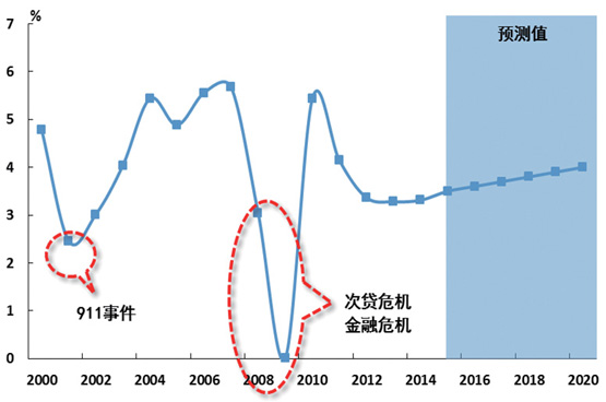發(fā)展中經(jīng)濟體地位繼續(xù)提升,經(jīng)濟增長的引擎回歸發(fā)達經(jīng)濟體。2000-2007年發(fā)展中經(jīng)濟體年均增速為6.7%,高于世界平均增速2.3個百分點。受到金融危機沖擊,發(fā)達經(jīng)濟體出現(xiàn)大幅度的下滑(如圖2所示),歐美日經(jīng)濟同時面臨巨大沖擊甚至出現(xiàn)萎縮,發(fā)展中經(jīng)濟體雖然經(jīng)濟增速有所下降,但明顯好于發(fā)達經(jīng)濟體,發(fā)展中經(jīng)濟體特別是中國一度扮演了世界經(jīng)濟增長引擎的角色。依托技術(shù)優(yōu)勢,發(fā)達經(jīng)濟體增速呈現(xiàn)回升態(tài)勢,而發(fā)展中經(jīng)濟體增速將有所放緩,與世界經(jīng)濟平均增速差異明顯縮小到1.1個百分點。預(yù)計“十三五”期發(fā)達經(jīng)濟體的年均增速為2.5%,發(fā)展中經(jīng)濟體為4.9%(如圖2所示)。按照對世界經(jīng)濟增長的絕對凈貢獻來計算,經(jīng)濟增長引擎開始回歸到發(fā)達經(jīng)濟體,這意味著相對于集裝箱而言,大宗貨物海運需求減緩將更加明顯。