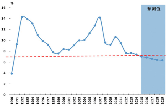 經(jīng)濟進入中速增長階段。圖5顯示了1990年以來我國經(jīng)濟增速的變化。2000-2010年我國經(jīng)濟、對外貿(mào)易分別保持了年均10.5%和20.2%的增長,2010年后呈現(xiàn)逐步放緩態(tài)勢,2014年降為7.4%。當(dāng)前,我國經(jīng)貿(mào)發(fā)展面臨十分復(fù)雜的國際環(huán)境,內(nèi)部則處于“三期”疊加期。隨著新型工業(yè)化、信息化、農(nóng)業(yè)現(xiàn)代化和城鎮(zhèn)化“新四化”的不斷推進,以及市場機遇、投資機遇、綠色機遇和對外合作機遇的不斷擴大,為我國經(jīng)濟增長提供了巨大潛力和回旋空間。這些發(fā)展環(huán)境變化使我國經(jīng)濟發(fā)展進入新常態(tài),預(yù)計2015年GDP增長約7%,“十三五”期間經(jīng)濟平均增速只要保持在6.6%(如圖5所示),即可實現(xiàn) 2020年GDP總量比2010年翻一番的戰(zhàn)略目標(biāo),按照人均GDP水平測算,我國將進入高收入國家行列,對海運需求質(zhì)量將全面提高。