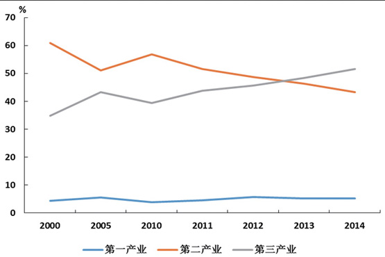 產(chǎn)業(yè)與區(qū)域經(jīng)濟結(jié)構(gòu)調(diào)整,第三產(chǎn)業(yè)成為經(jīng)濟增長的主要動力。隨著經(jīng)濟社會的進步,經(jīng)濟結(jié)構(gòu)不斷優(yōu)化,第三產(chǎn)業(yè)所占比重逐步提高,并于2013年首次超過第二產(chǎn)業(yè)(如圖6所示)。未來,經(jīng)濟將進入中速增長階段,而第三產(chǎn)業(yè)可望保持相對較快的增長,占GDP比重持續(xù)提高,結(jié)構(gòu)不斷優(yōu)化。從三駕馬車的貢獻來看,外貿(mào)和投資的作用逐漸減弱,經(jīng)濟增長主要依托消費的增長。消費的增長并不能像第二產(chǎn)業(yè)那樣直接拉動運輸需求量的增長,這一態(tài)勢使得運輸需求對GDP增速彈性減弱。