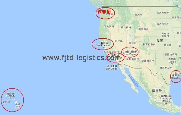 美西航線的主要港口有:Los Angeles洛杉磯;Long Beach長灘;San Francisco舊金山;Portland波特蘭;Seattle西雅圖等。