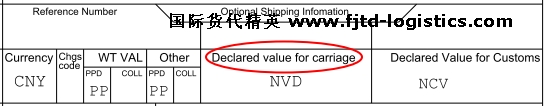 航空運(yùn)單上有一欄“Declared Value for Carriage”(對(duì)承運(yùn)人的聲明價(jià)值)。如果沒有向承運(yùn)人聲明價(jià)值,則會(huì)注明“NVD”——“ No Value Declared”(沒有聲明價(jià)值)。如圖: