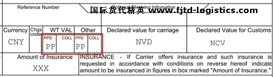 2. 航空運(yùn)費(fèi)(Airfreight)和聲明價(jià)值附加費(fèi)(Declared Value for Carriage),必須同時(shí)預(yù)付(PP)或同時(shí)到付(CC)。也就是說,航空運(yùn)費(fèi)和聲明價(jià)值附加費(fèi),要么都預(yù)付,要么都到付;不能一個(gè)預(yù)付,一個(gè)到付。
