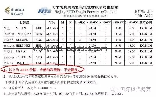 2)以上報(bào)價(jià)不含燃油附加費(fèi)和安全附加費(fèi),燃油附加費(fèi)FSC 1.6/KG,安全附加費(fèi)SCC 1/KG