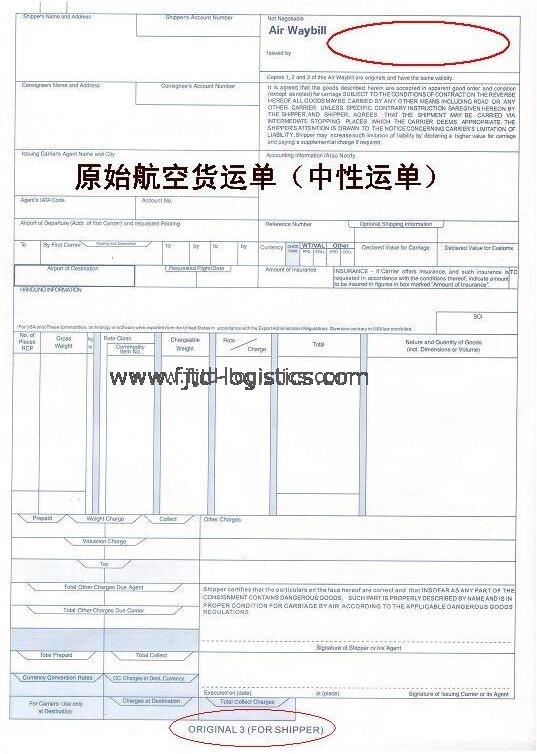“非中性運單”就是承運人(航空公司)的運單了。這種運單上印有航空公司的名稱、Logo、票證代號(三位數(shù)字)及包括校驗碼在內(nèi)的主單號(MAWB)等信息。這些信息用于區(qū)分不同航空公司的運單。