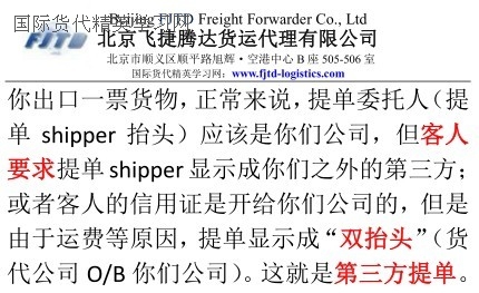 換言之,你出口一票貨物,正常來(lái)說(shuō),提單委托人(提單shipper抬頭)應(yīng)該是你們公司,但客人要求提單shipper顯示成你們之外的第三方;或者客人的信用證是開(kāi)給你們公司的,但是由于運(yùn)費(fèi)等原因,提單顯示成“雙抬頭”(貨代公司O/B你們公司)。為什么有人誤以為貨代提單是第三方提單?因?yàn)樘釂物@示成“雙抬頭”(貨代公司O/B你們公司),其實(shí)這不是貨代提單,只不過(guò)是提單顯示成“雙抬頭”(貨代公司O/B你們公司)的第三方提單而已。
