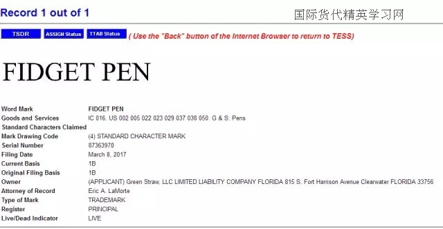 減壓筆(Fidget Pen)專利方面因?yàn)榇嬖?8個月以上檢索盲期的原因,暫時尚未浮現(xiàn),但是在商標(biāo)方面,美國已申請了Fidget Pen在16類文具用品,歐盟和英國均沒有相同商標(biāo)申請,中國有“fidget”一詞申請了16類文具用品,日本有“fidget”申請了28類玩具項目,但是都尚未核準(zhǔn)注冊。