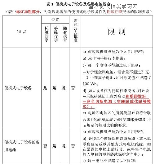 (表中標(biāo)紅加粗部分,為新規(guī)定增加的便攜式電子設(shè)備作為托運(yùn)行李交運(yùn)的限制要求)