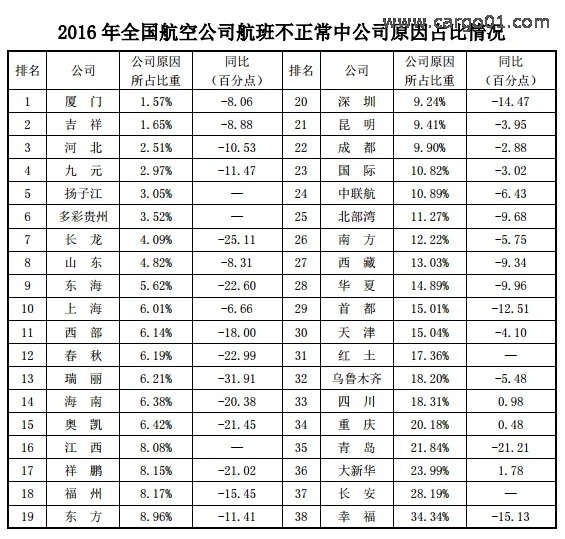 2016年航班正常率顯著提高 航空公司原因延誤占比下降近10個(gè)百分點(diǎn)
