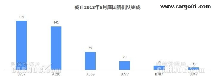 截止2018年6月底,國航客運(yùn)飛機(jī)總數(shù)411架,占國內(nèi)機(jī)隊(duì)總數(shù)的12.8%;截止2018年6月底,國航B737,A320數(shù)量最多,分別為159架、141架。