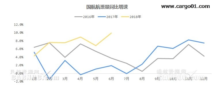 2016年以來,國航執(zhí)飛航班量在波動(dòng)中上升,從近兩年表現(xiàn)來看,下半年增速較為穩(wěn)定,相比前兩年,2018年上半年增速有所提升且更為穩(wěn)定。