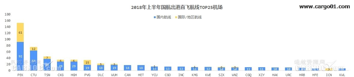 2018年上半年國航出港直飛航線TOP25機(jī)場中,有一個(gè)國外機(jī)場(首爾仁川,7條出港直飛航線)。