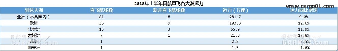 2018年上半年,國航僅1條非洲、南美洲航線,運(yùn)力分別下降8.5%、1.6%;在大洋洲運(yùn)力增速最快,同比增加17.8%。