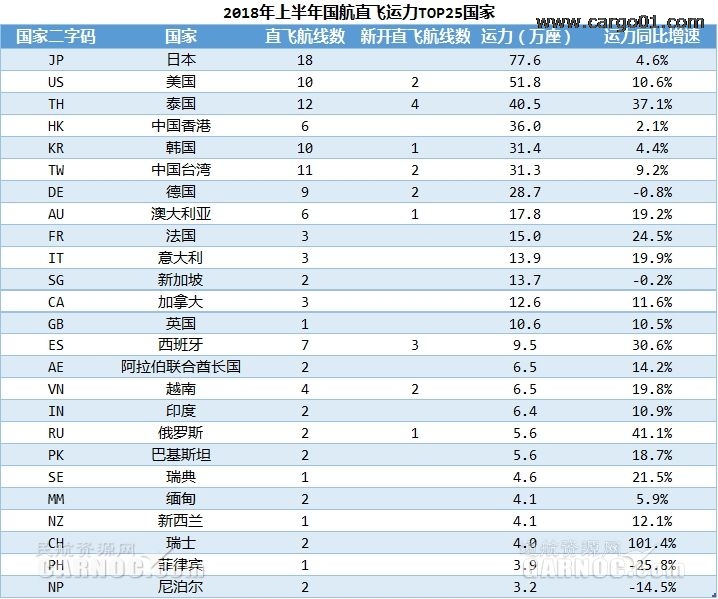 直飛日本運(yùn)力最多,為77.6萬座,同比增加4.6%,直飛日本航線18條,相比2017年上半年,無新開直飛日本航線。