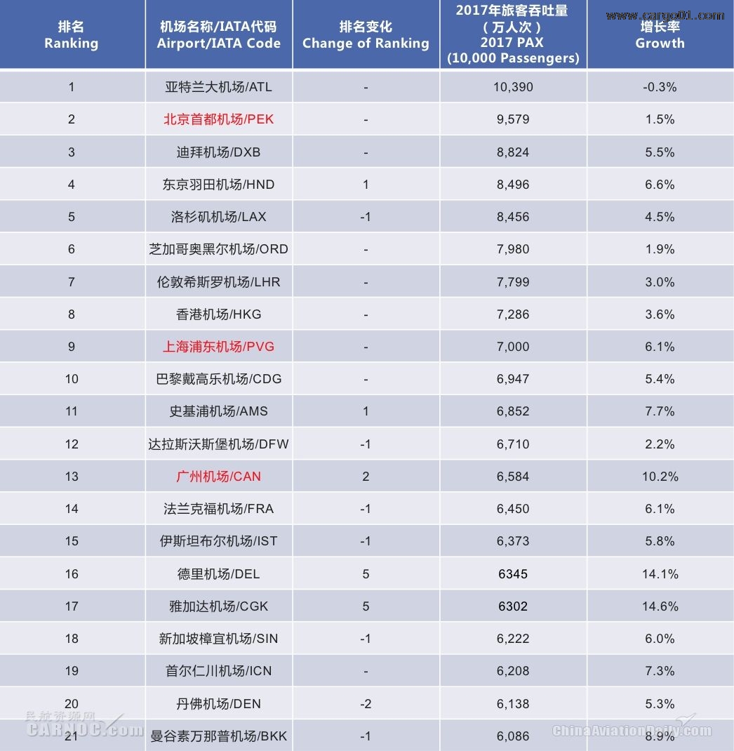 CADAS:2017年全球機(jī)場(chǎng)吞吐量TOP50出爐