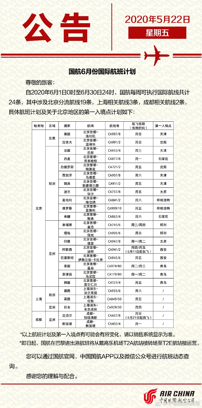 自2020年6月1日0時(shí)至6月30日24時(shí),國航每周可執(zhí)行國際航線共計(jì)24條,其中涉及北京分流航線19條,上海相關(guān)航線3條,成都相關(guān)航線2條,具體航班計(jì)劃及關(guān)于北京地區(qū)的第一入境點(diǎn)計(jì)劃如下。